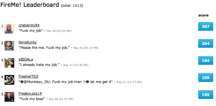 The app also comes with a “FireMeter” that rates how close you are to being fired, and includes a “leaderboard” where users rank amongst other job-haters. The leader as of Thursday’s most recently tweeted “Please fire me. F— my job.” Not looking like a strong candidate for “Employee of the Month” anytime soon.