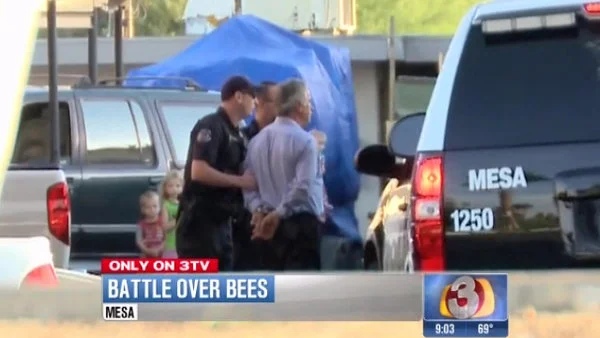 As the KTVK crew began capturing video of the hive and interviewing residents, a man drove up and demanded the crew leave the property. The man, Mike Djordejvich, then used his shoulders to butt the photographer, who went tumbling to the ground.