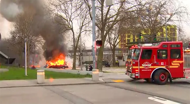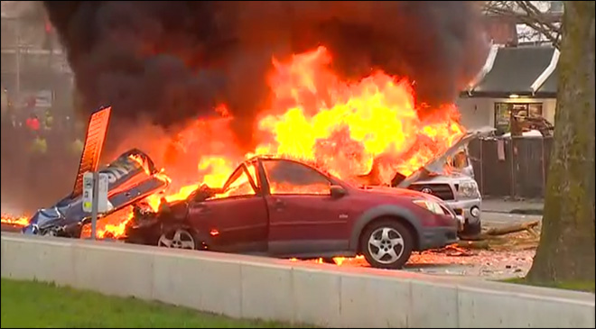 KOMO reports that two vehicles were struck in the crash. Witnesses said a man could be seen running from from one car with his sleeve on fire, and he was extinguished by officers at the scene.