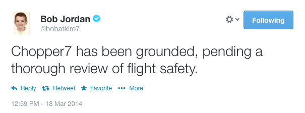 KIRO News Director Bob Jordan sent out this tweet just a minute ago saying that the station was grounding their chopper.