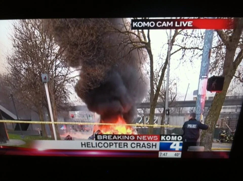 Corwin Haeck, a KOMO news radio reporter, said he heard the crash from the KOMO newsroom, grabbed his microphone and recorder, and rushed down to the street. “I couldn’t believe what I was seeing in front of my eyes. Our own news chopper in a ball of fire.”