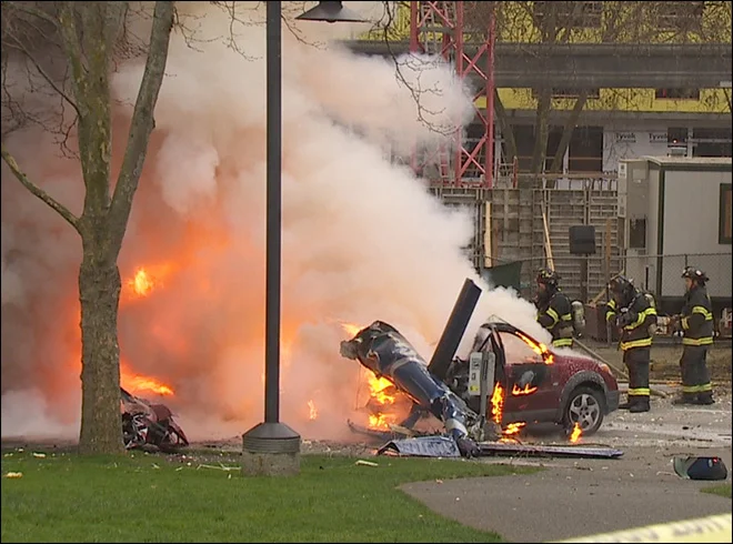 Newman suffered second- and third-degree burns on his back and arms when his car was set afire by the helicopter crashing into the street near the Space Needle. Two other drivers whose vehicles burned escaped uninjured.
