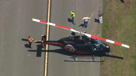 The helicopter's tail rotor was heavily damaged as it veered to the right after takeoff and then landed on a taxiway. Video from Live Sky 5 showed part of the tail section had broken off and landed several feet away from the helicopter.