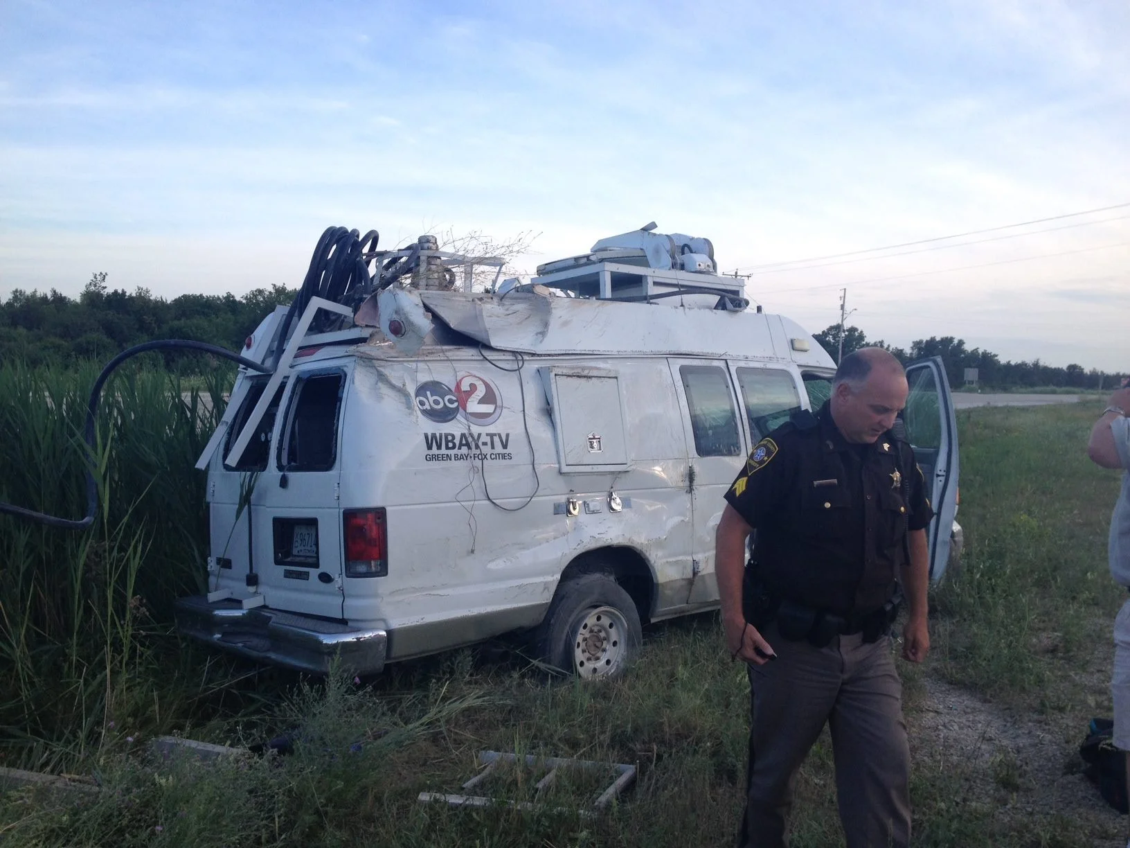 /A WBAY news crew had a scary situation, when their live truck blew a tire, went off the road and rolled over.