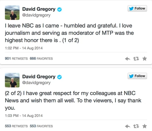 /As FTVLive reported multiple times, David Gregory was 'dead man walking' even back when NBC suits flew into DC and said, "He's our man". Anytime a suit has to defend someone, it's the kiss of death. Now there are reports the network gave Gregory some extra $$ to go out 'nicely'.