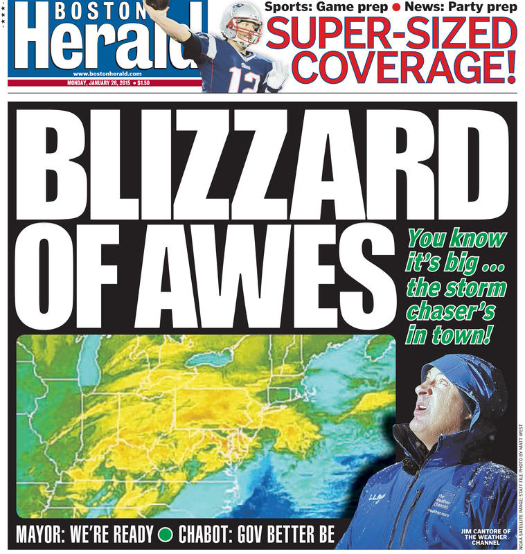 The Boston Herald's cover is helping feed the ego of windshield wiper salesman and Weather Channel Anchor Jim "The American Bald Ego" Cantore: