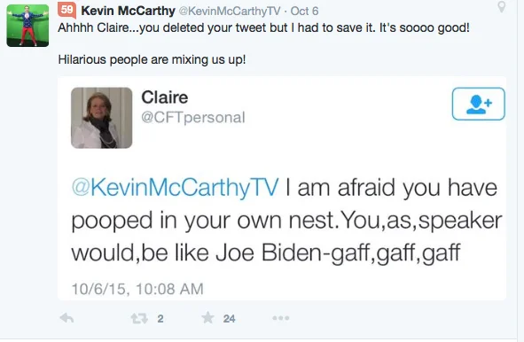 Here's where it gets scary. Some imbecile's on Twitter, don't know the difference, which is making for some funny material for the TV Kevin McCarthy.