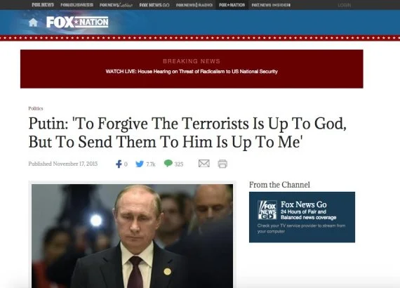 Fox News posted the quote, "To forgive the terrorists is up to God but to send them to him is up to me" and attributed to Putin.