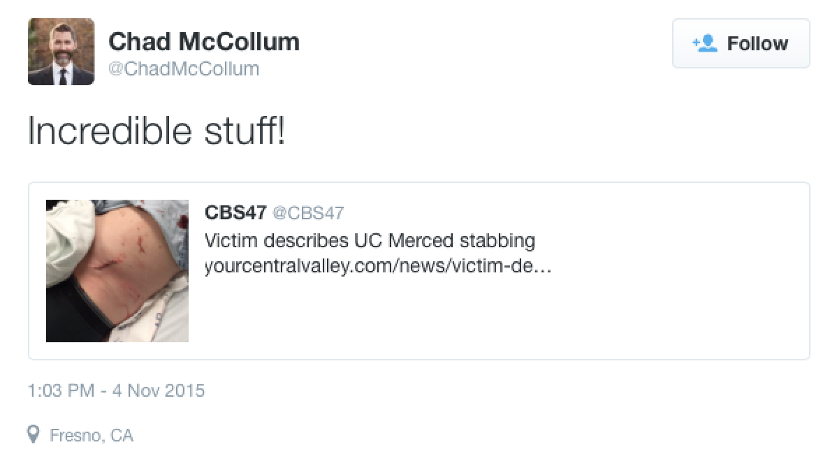 The Fresno stations were working the story and when one Reporter tweeted a picture of a stabbing victim, KSEE/KGPE News Director Chad McCollum tweeted out this: