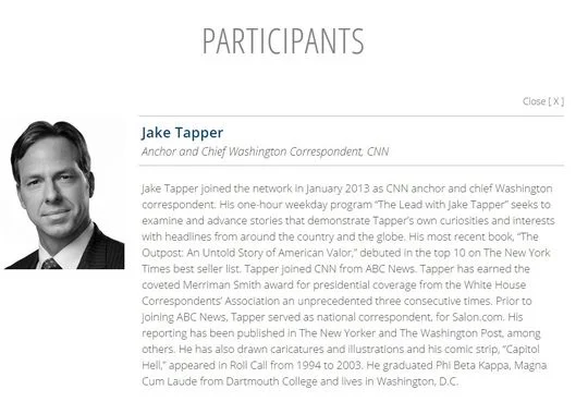 Up until late Tuesday afternoon, CNN's Jake Tapper was listed on the Clinton Foundation website (screen shot right) as a "speaker" at a Clinton Global Initiative event scheduled for June 8-10 in Denver.