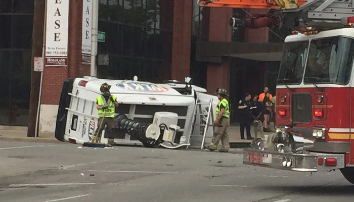 WLKY's live truck was dead in the middle of the road after cops say a Ford sedan ran a red light and slammed right into the news truck.