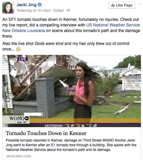 /It's a good thing TV doesn't require common sense to become talent. WGNO (New Orleans) anchor Jacki Jing went into the field to report on severe weather. Not just any weather, but an EF-1 tornado that touched down in the DMA.