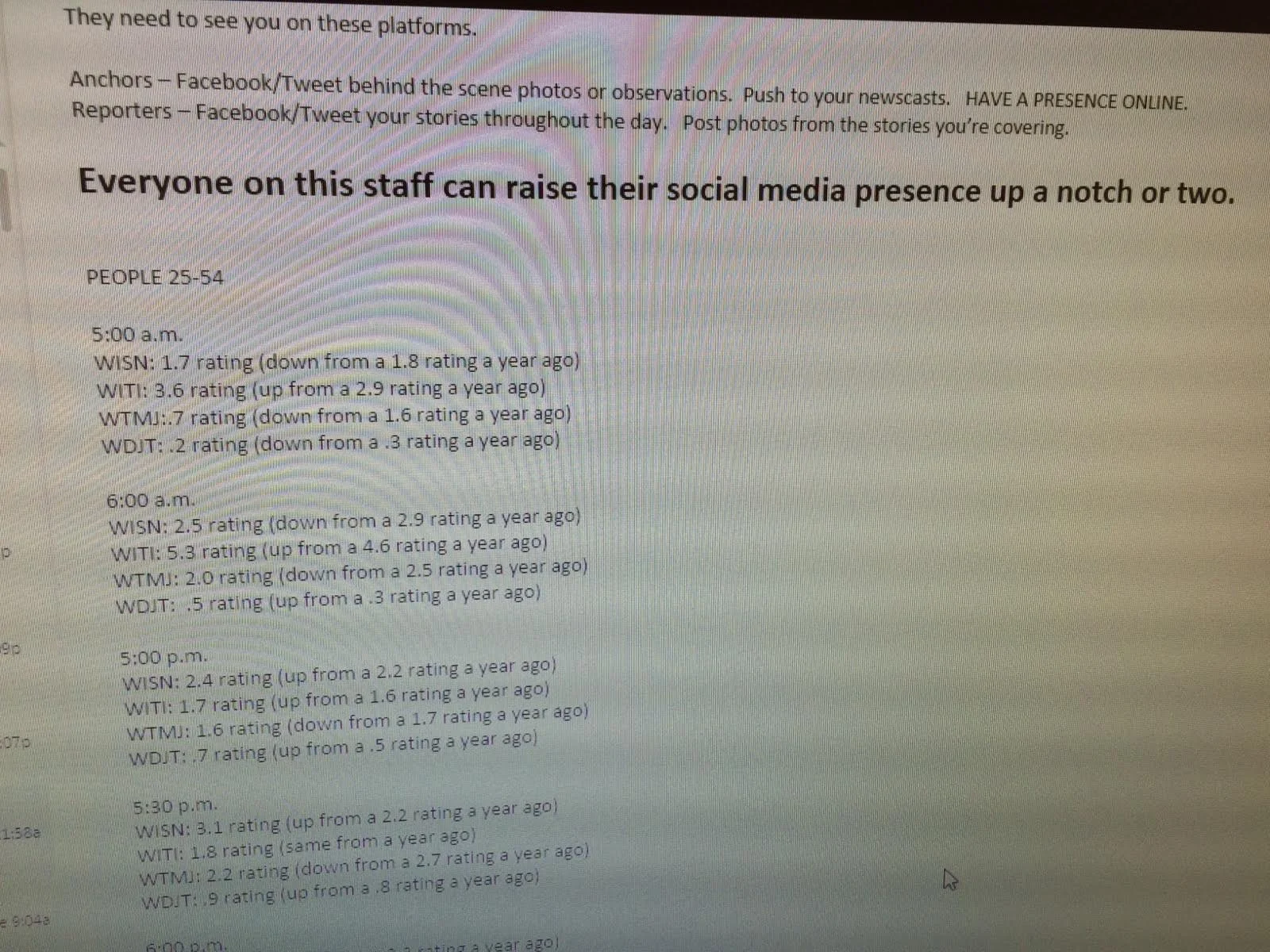 But then he told talent they need to be more active on social media. He wants Anchors to, "push to your newscast." Reporters need post photo's from stories they are covering.