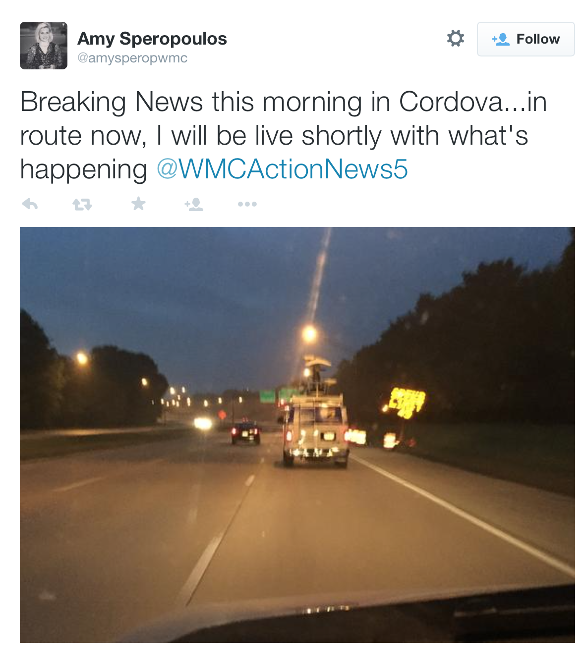 /WMC (Memphis) Reporter Amy Speropoulos was driving to a breaking news story early this morning. She was following the station's live truck and sent out this tweet: