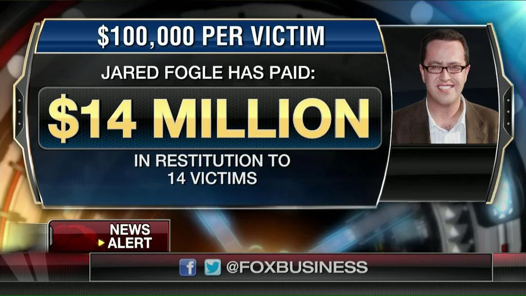 /Fox Business ran a graphic and then also tweeted it out saying that former Subway pitchman Jared Fogle was paying restitution of $100,000 to 14 of his victims. The graphic said Fogle would shell out $14 million bucks.