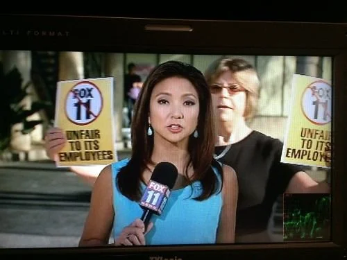 /Back a few weeks ago, FTVLive told you that the union was photobombing KTTV's live shots as negotiations between the two sides have not been going well.