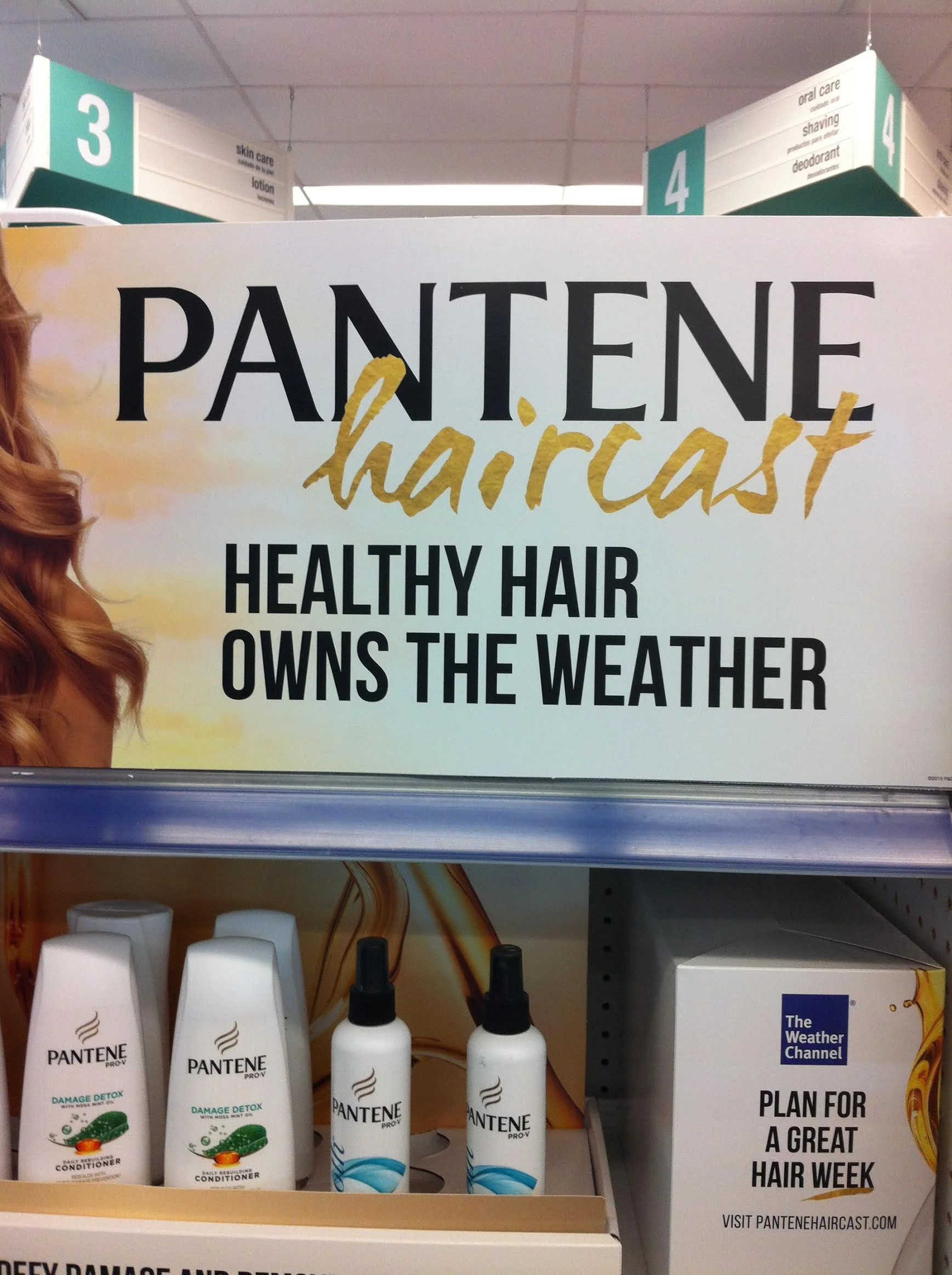 This display in a Wal-Mart shows that The Weather Channel has teamed up with Pantene to give you the Pantene Haircast.