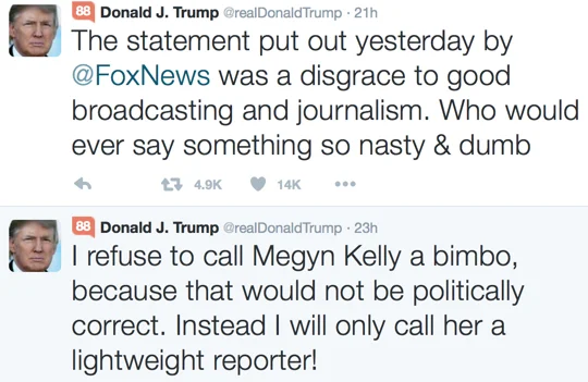 /The Donald says he's not appearing on Fox' GOP debate and Fox says it's not budging on including Megyn Kelly as a moderator.