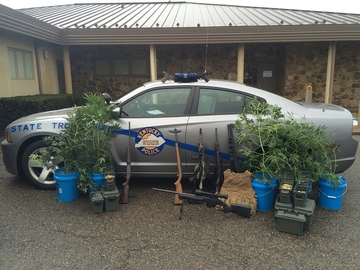 Troopers say they found five marijuana plants, six long guns, two pistols, two silencers, eight storage boxes of ammunition, a tactical vest, and multiple items used to grow marijuana, as well as two more marijuana plants found in a trash can behind the residence.