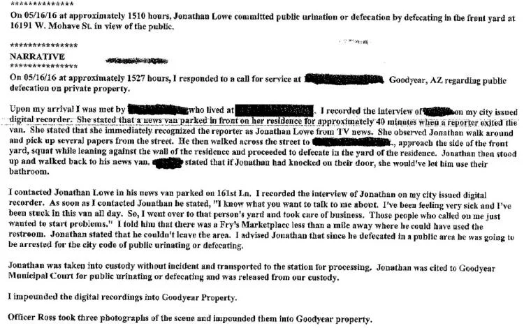 /FTVLive was the FIRST to report about KPHO Reporter Jonathan Lowe and his arrest for pooping in a resident's yard while covering a story in Goodyear, AZ.