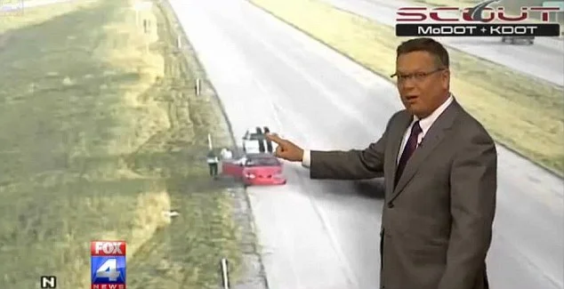 The man in a red Mustang was stuck on the side of the highway and for some reason WDAF traffic reporter Nick Vasos thought this was news.