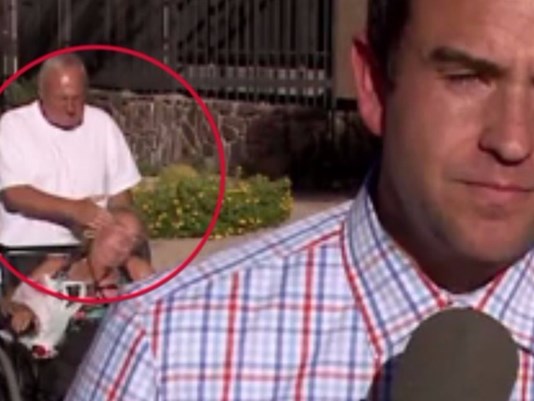 KPNZ Reporter Joe Dana was doing a live hit from downtown. In the background, you could see a man pushing an elderly woman in a wheelchair. The man ended up slapping the old lady and it was all caught on camera.