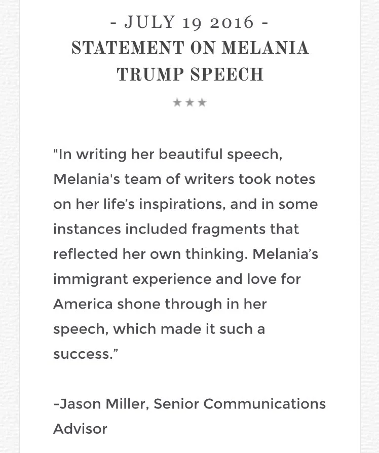 Despite the fact that both Melania and Donald Trump says she wrote the speech herself, the Trump campaign has released this statement about her copying parts of Obama's speech almost word for word.