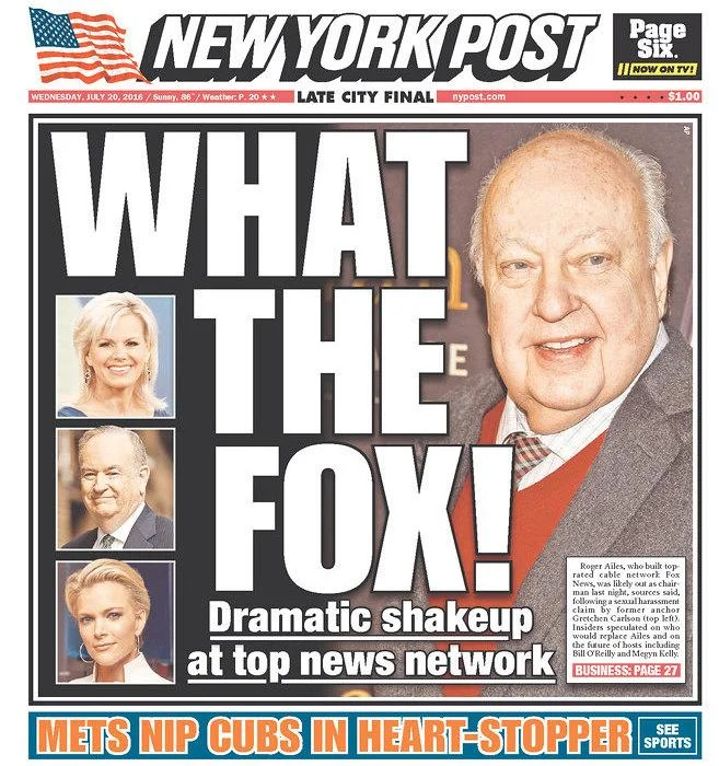 Well, now that it appears that Ailes is all but done at Fox News, let's take a look at the cover of Today's NY Post.