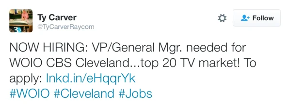 FTVLive first reported that WOIO GM Dominic Mancuso is being shown the door. Now, the company is using Twitter to help find his replacement. Raycom recruiter Ty Carver, whom no one has ever heard of, tweeted this search: