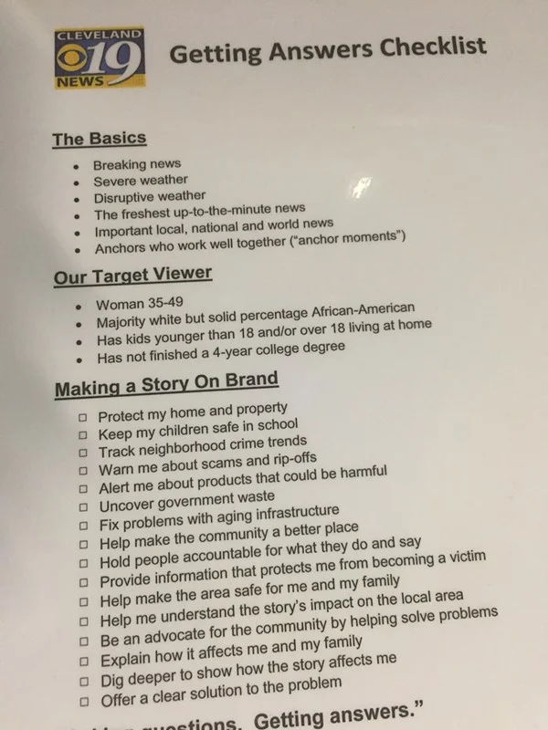 Management has posted "Getting Answers Checklist" around the building, so staff will know exactly who the story is geared to and how to stay on brand.